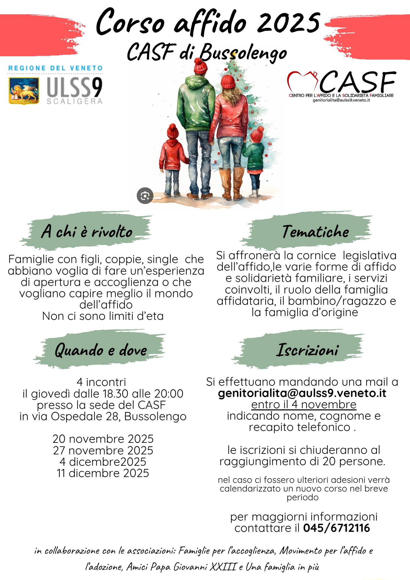 Il CASF di Bussolengo, in collaborazione con le associazioni Famiglie per l'accoglienza, Movimento per l'affido e l'adozione, Papa Giovanni XXIII e Una famiglia in più, organizza il corso affido 2025.